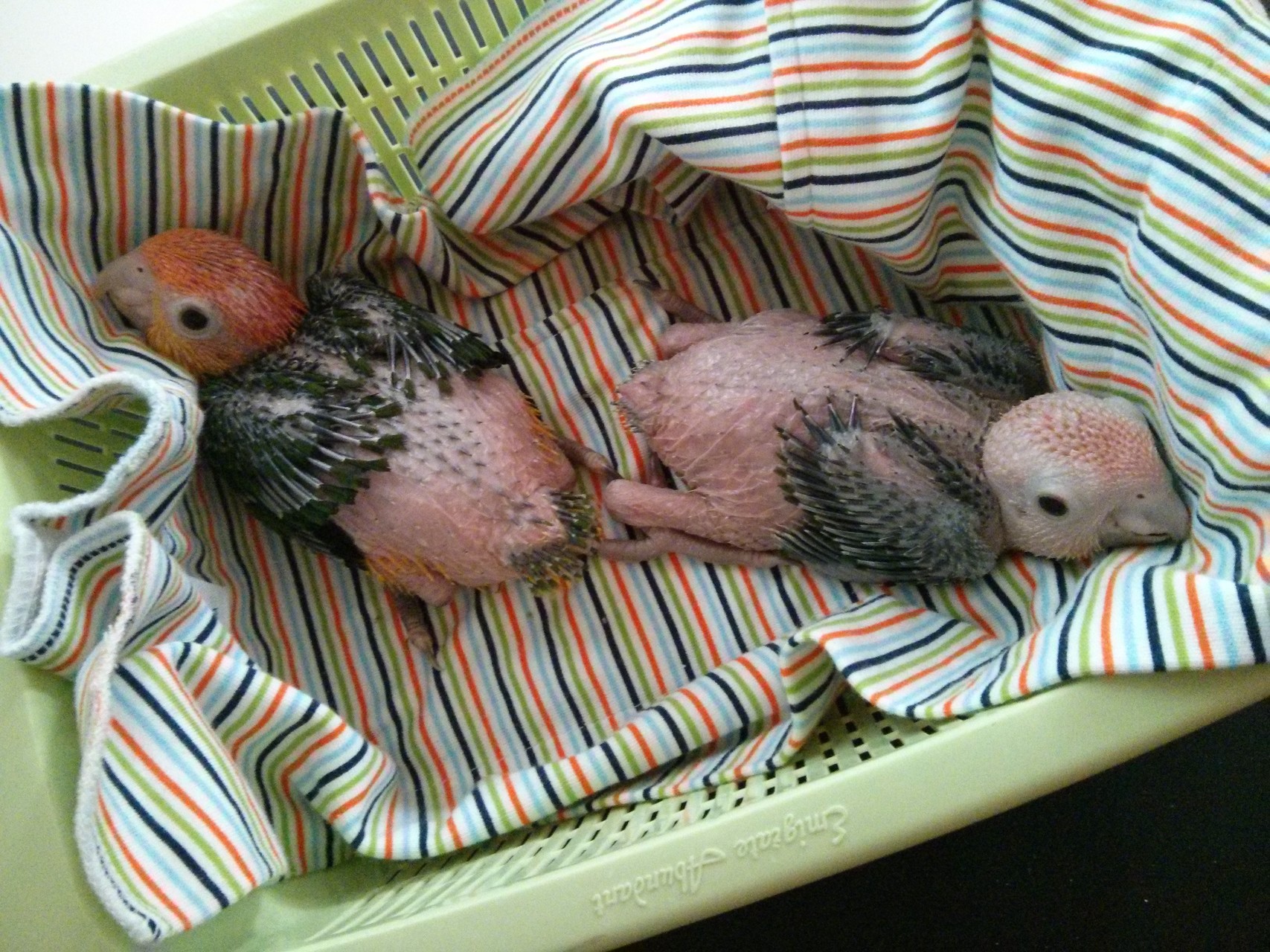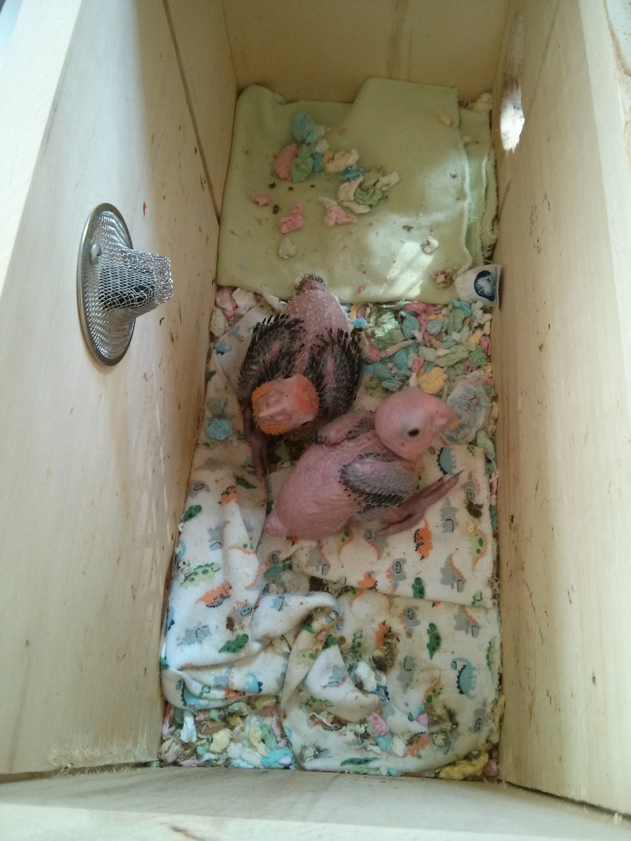 Myles took over the care and feeding immediately after hatching. We kept the nest box warm with heaters and made sure Myles had plenty of food available ranging from standard pellets to doughnuts. We co-parented the chicks which is easy to do with Myles because he is extremely tolerant of our handling of both the chicks and him. Therefore we could bring them out together and Myles would feed the chicks even while we were holding them. We did not handle the chicks much until they opened their eyes, but then spent time daily with them.
